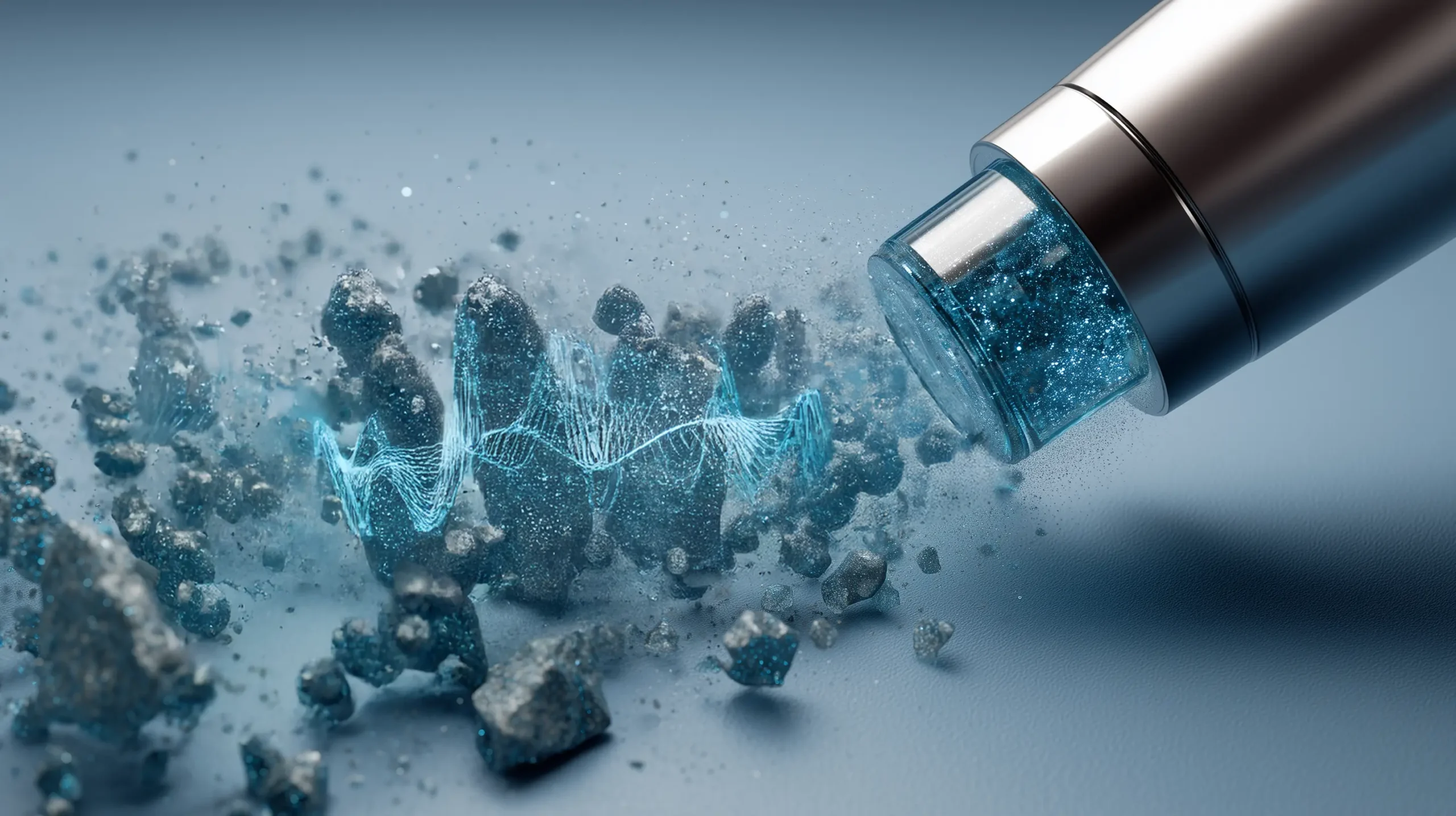 - Die Stoßwellen treffen auf den Stein und zerkleinern ihn durch die freigesetzte Energie in kleinere Fragmente.